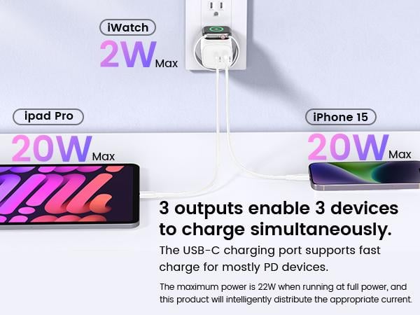 Dual Port iWatch Charger: Charging block with dual-port fast charging, 20W USB-C port and 18W USB port, supports fast charging of most PD3.0, QC4+ protocol devices, you can quickly charge your new iPhone to 50% battery power in 30 minutes, meeting your needs of charging multiple devices at the same time.